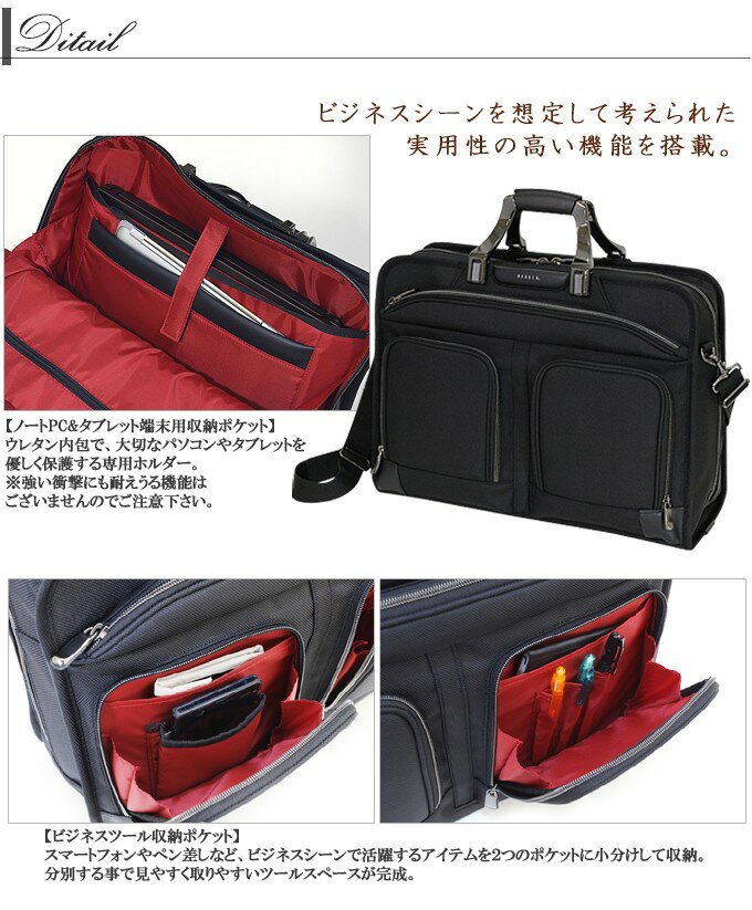 ビジネスシーンで大活躍のブリーフケース サイズ:幅45x高さ32x奥行14(cm) 重量:約1,390g 素材・成分:本体:ナイロン 【外側前面】 ・ジッパーポケット×1 ・ラウンド型ジッパーポケット×2 ・ラウンド型ジッパーポケット(右側)内装に、ペン差し×3、オープンポケット×1 ・ラウンド型ジッパーポケット(左側)内装に、スマートフォン用オープンポケット×1、オープンポケット×1 【外側後面】 ・ジッパーポケット×1 ・キャリーオン機能用ベルト 【内側前同側】 ・タブレット端末用オープンポケット(マジックテープ留)×1 ・ノートパソコン用オープンポケット×1 【内側前同側】 ・ ジッパーポケットオープンポケット×1レザーを巻いて手に馴染むよう配慮した樹脂製のハンドルを使用。